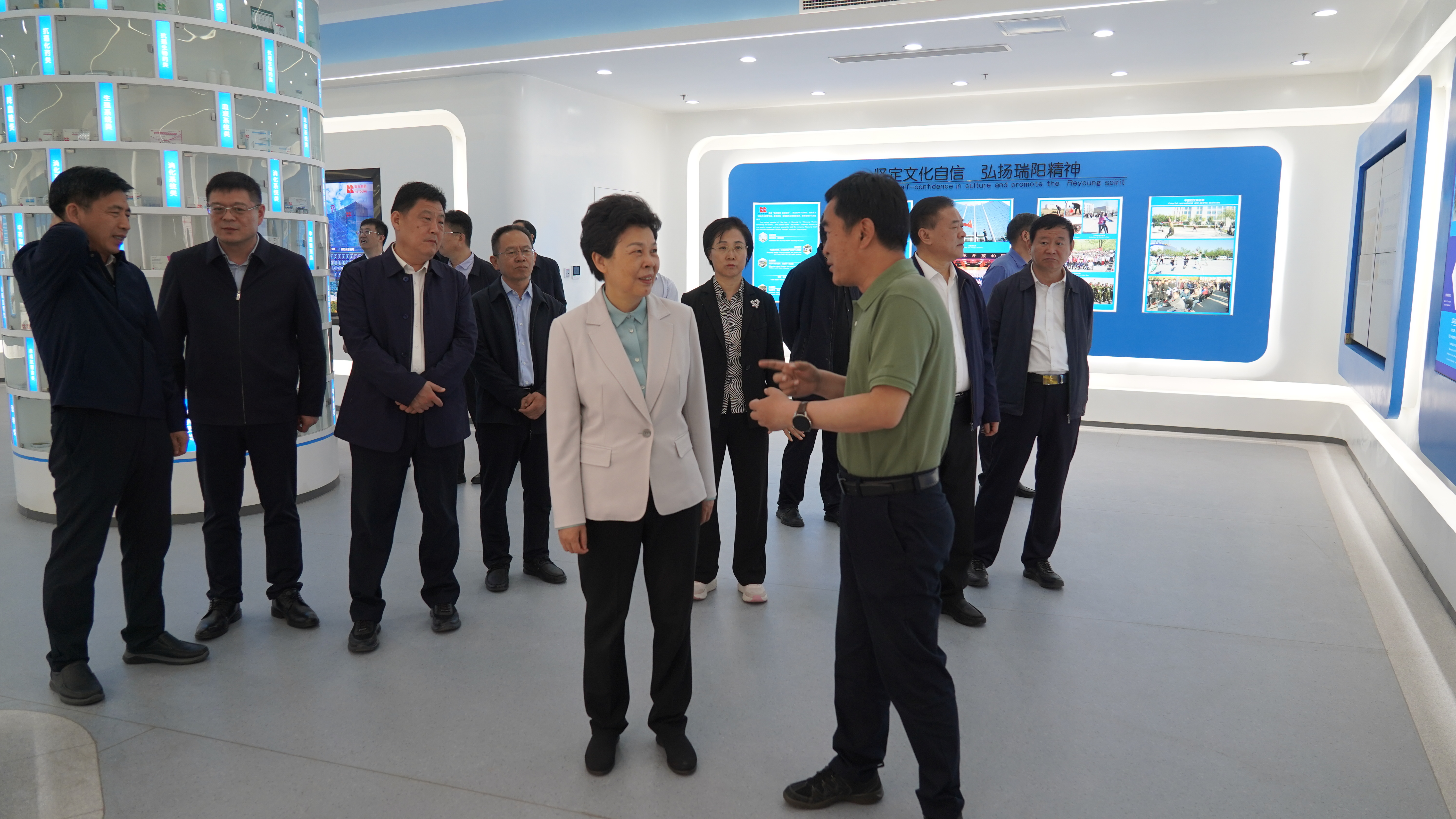 調研期間,葛慧君主席在苗董事長陪同下,觀看了公司宣傳片并參觀了公司展廳,深入了解公司近年來在產品研發、質量控制、智能工廠建設、市場拓展及社會責任等方面的所做出的努力。參觀過程中,苗董事長就公司當前的運營狀況、未來發展戰略等做了詳盡匯報。苗董事長表示:“面對新時代的機遇與挑戰,瑞陽制藥始終堅持創新驅動發展戰略,不斷加大研發投入,持續優化產品結構,致力于醫藥行業領軍企業,力爭經濟社會高質量發展貢獻更多力量。”